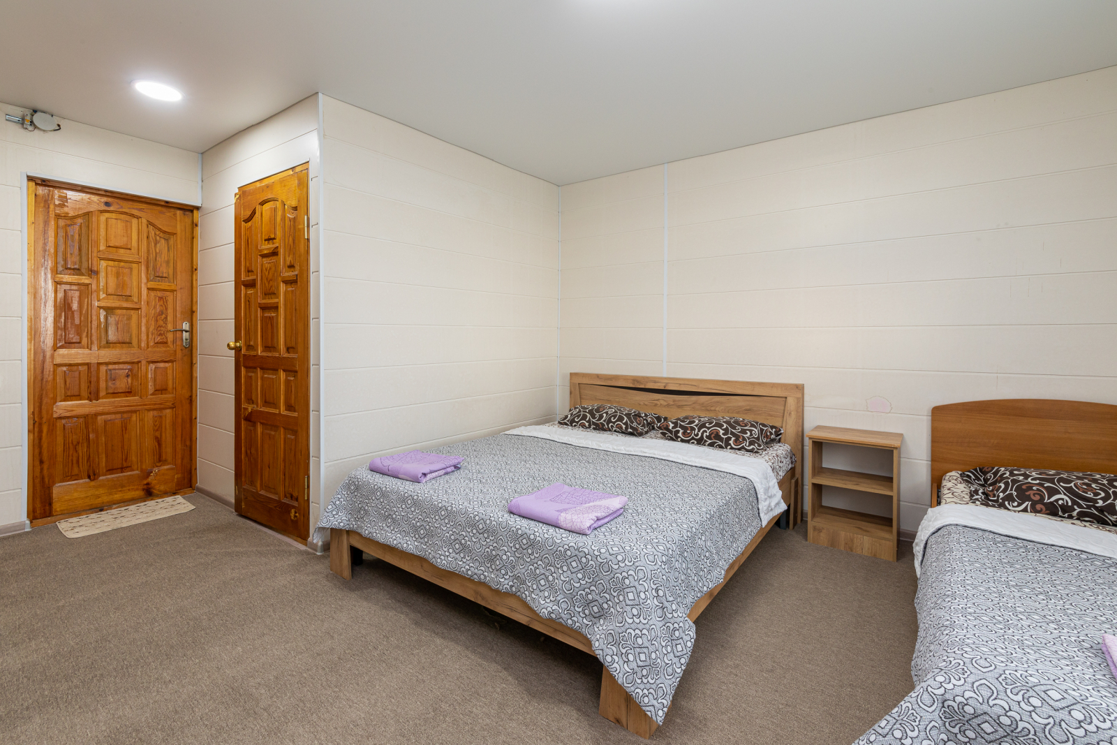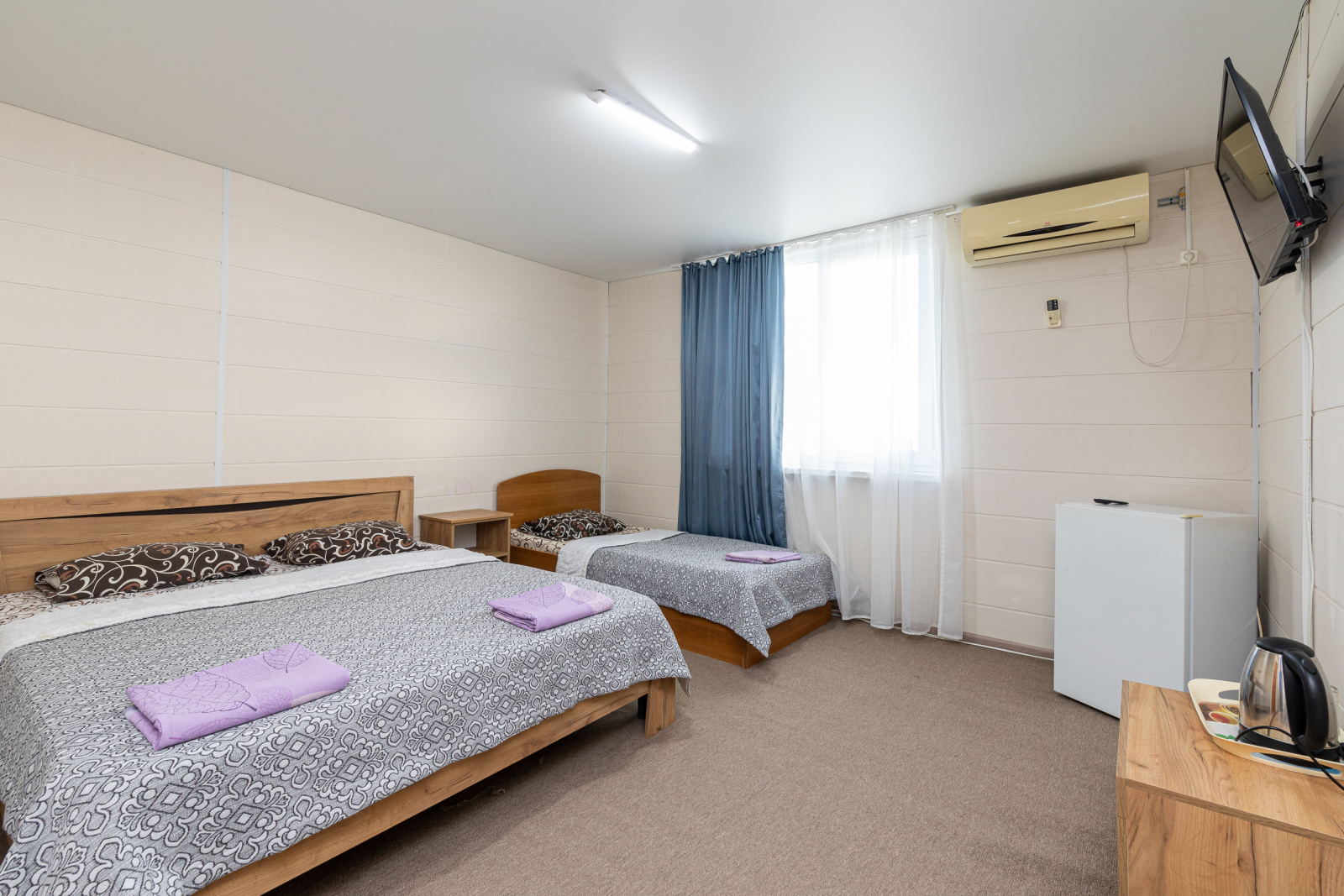 3 осн. места. Мебель: вешалка, зеркало, кровать двуспальная, кровать односпальная, прикроватные тумбочки, шкаф. Оборудование: кондиционер, телевизор, холодильник. Санузел. Сервис: смена полотенец, смена постельного белья, уборка номера.