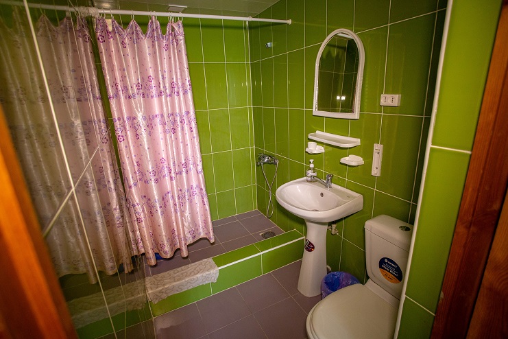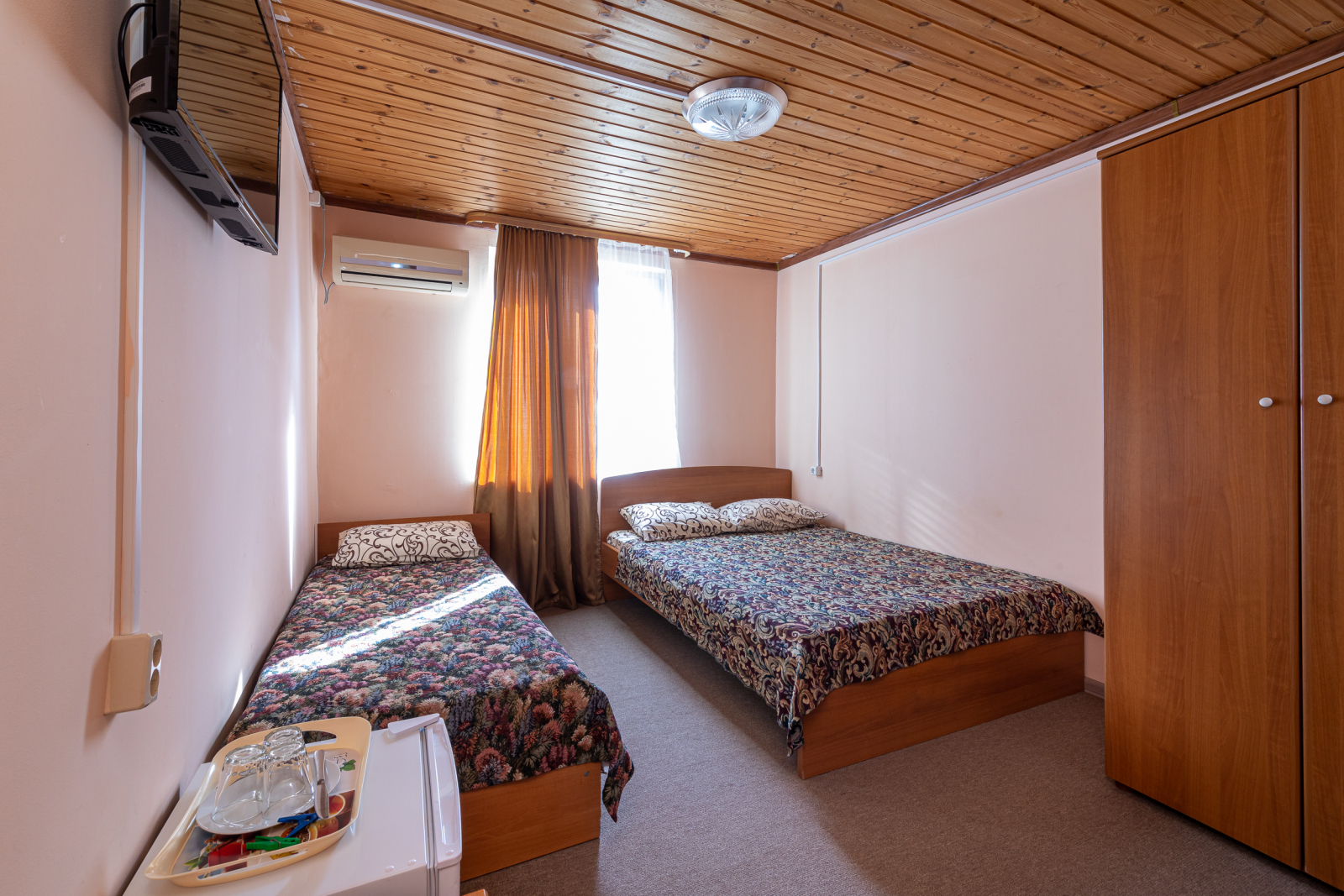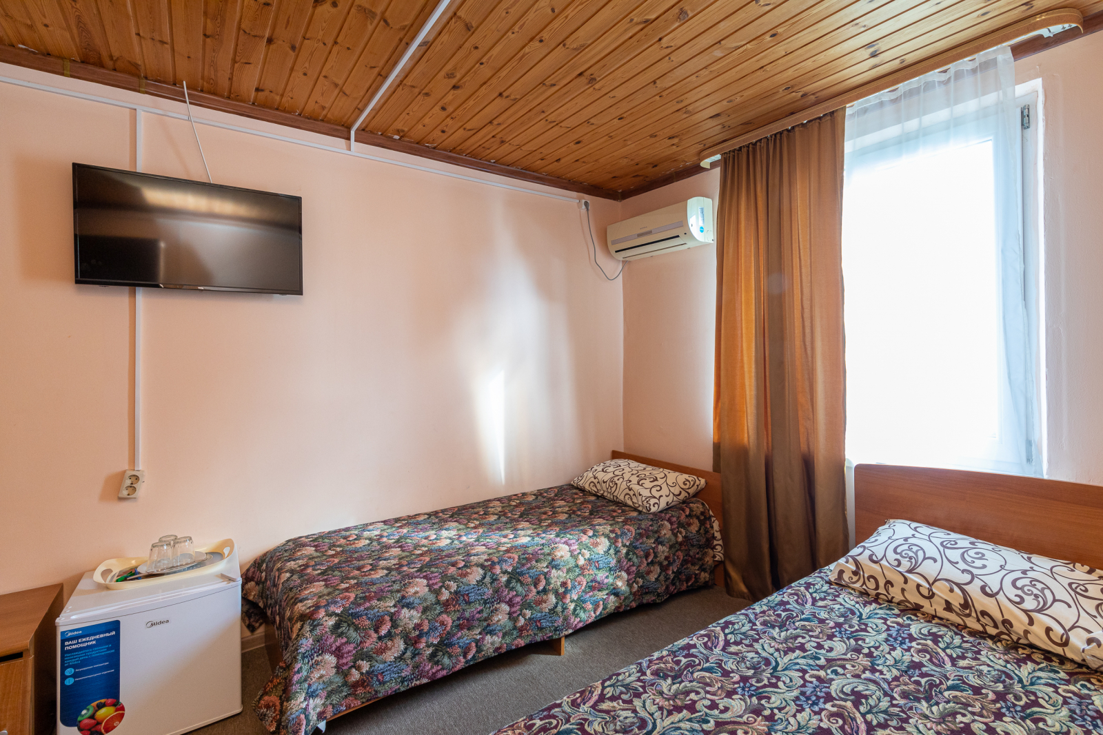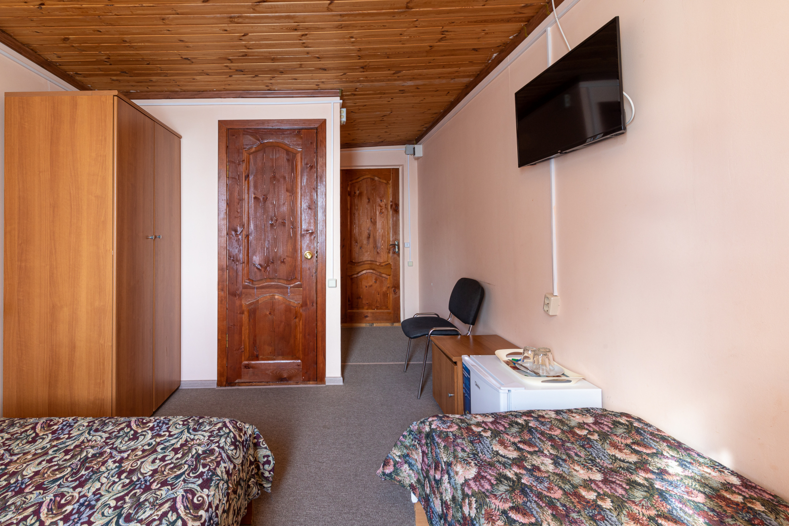 3 осн. места. Мебель: вешалка, зеркало, кровать двуспальная, кровать односпальная, прикроватные тумбочки, стул, шкаф. Оборудование: кондиционер (или вентилятор), телевизор, холодильник. Санузел. Сервис: смена полотенец, смена постельного белья, уборка номера.