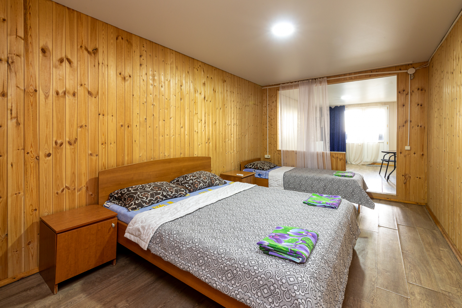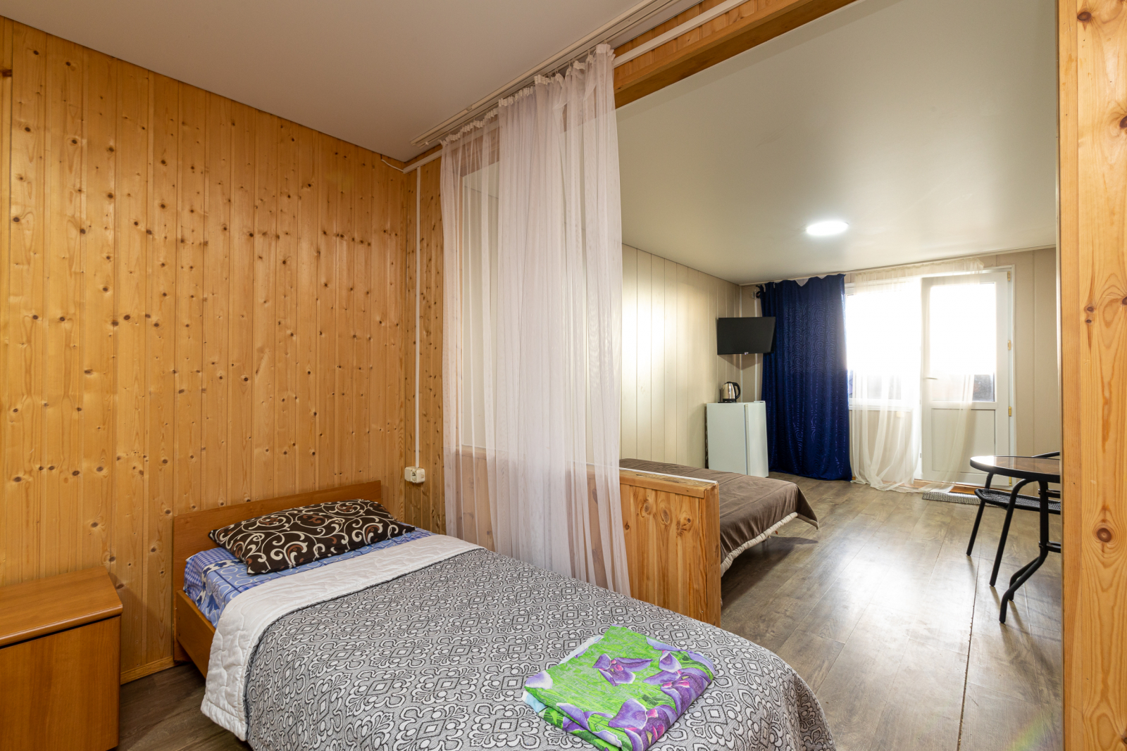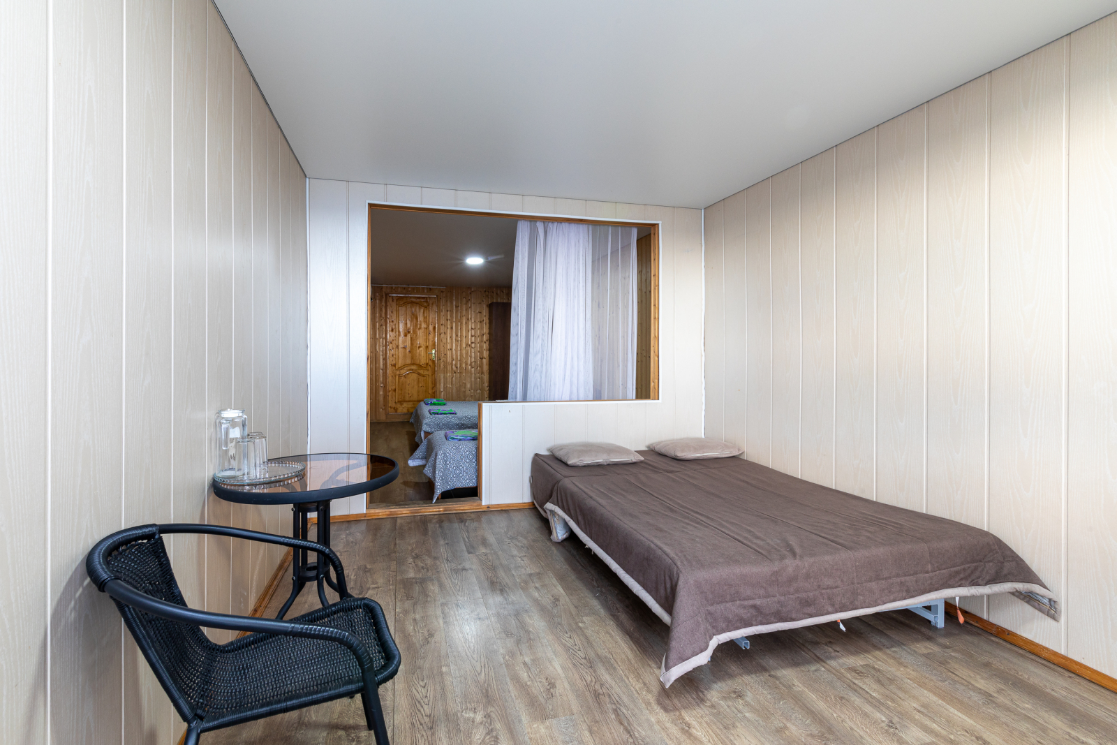 4 осн. места. Балкон общий. Мебель: вешалка, диван раскладной, зеркало, кровать двуспальная, кровать односпальная, прикроватные тумбочки, стол, стул, шкаф. Оборудование: кондиционер, телевизор, холодильник. Санузел: с душем, фен. Сервис: смена полотенец, смена постельного белья, уборка номера.