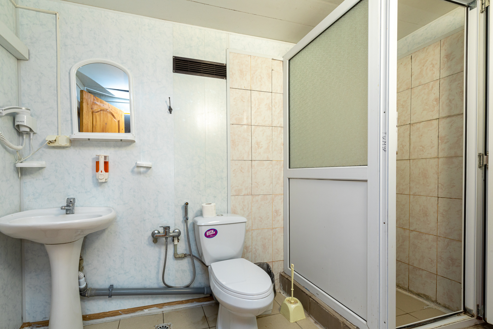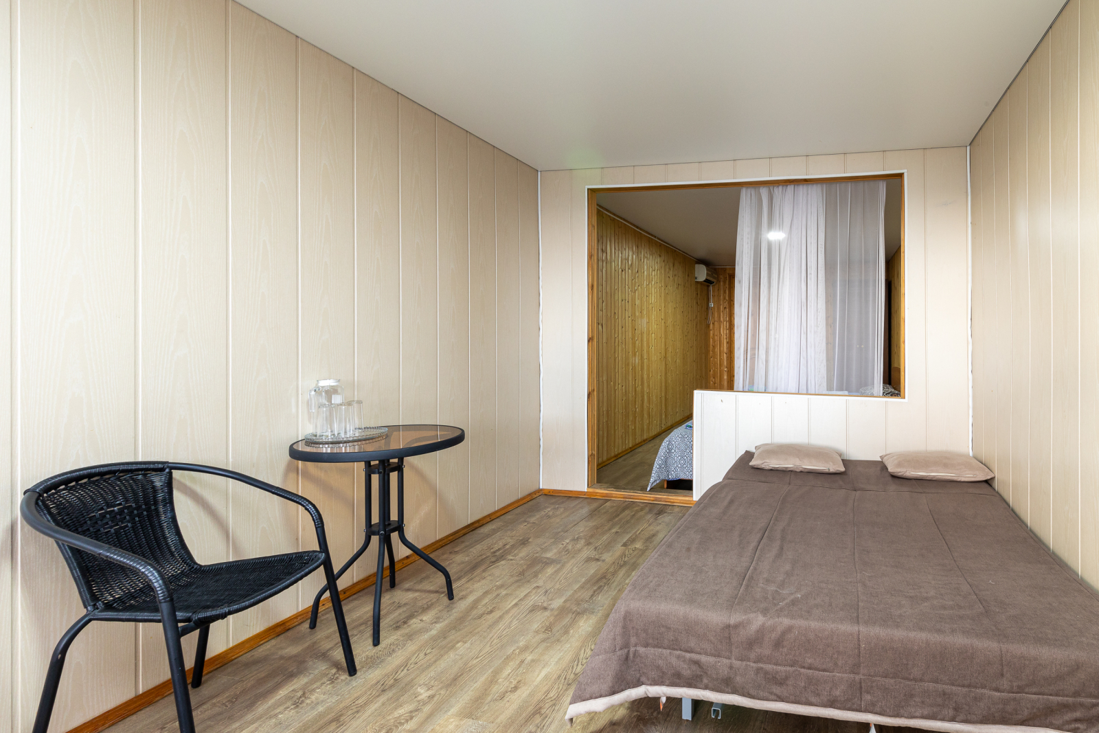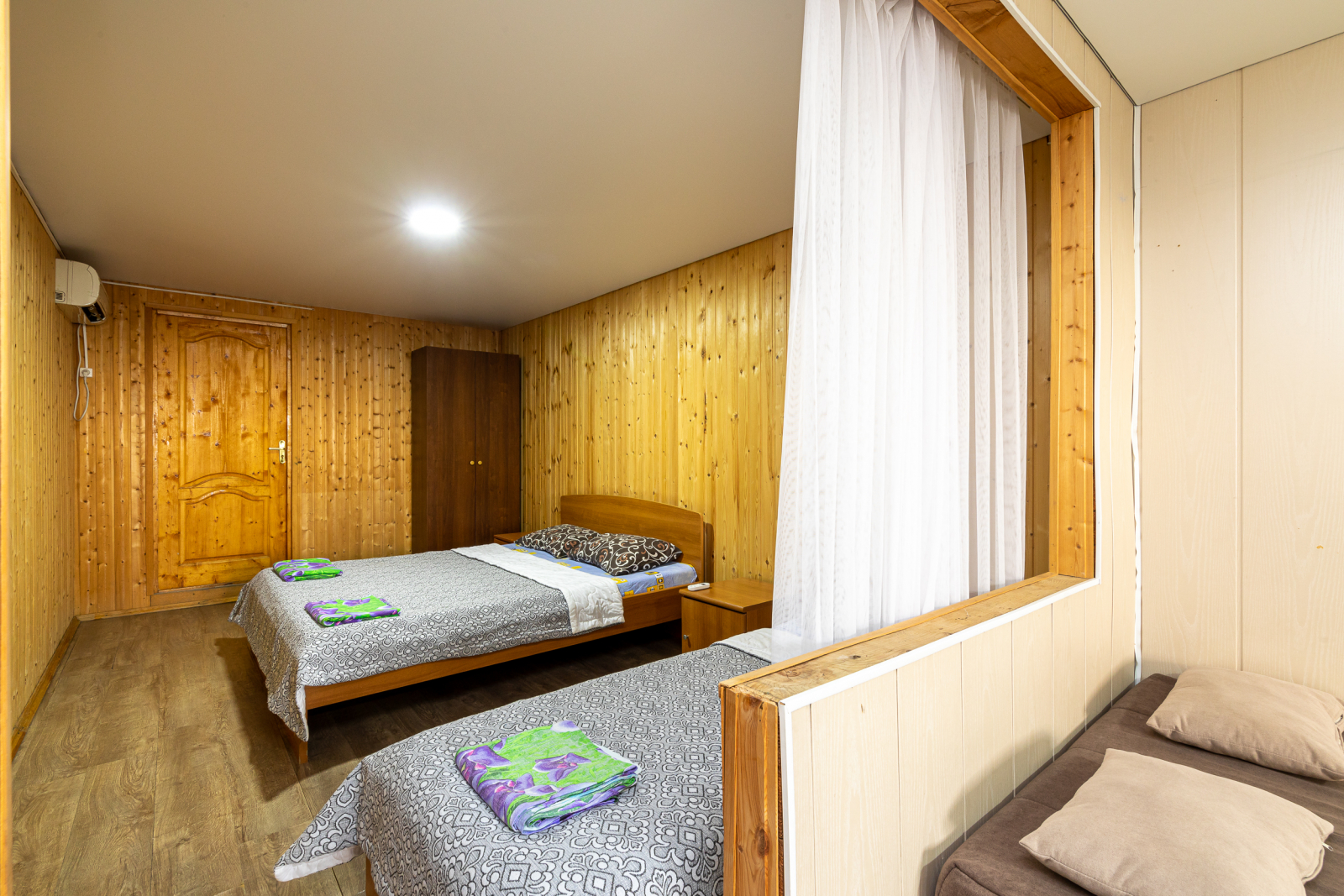 4 осн. места. Балкон общий. Мебель: вешалка, диван раскладной, зеркало, кровать двуспальная, кровать односпальная, прикроватные тумбочки, стол, стул, шкаф. Оборудование: кондиционер, телевизор, холодильник. Санузел: с душем, фен. Сервис: смена полотенец, смена постельного белья, уборка номера.